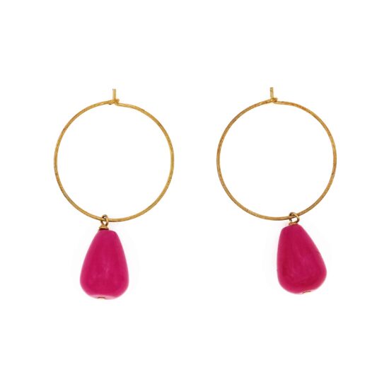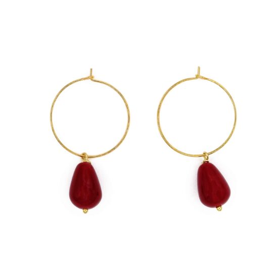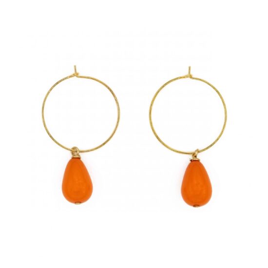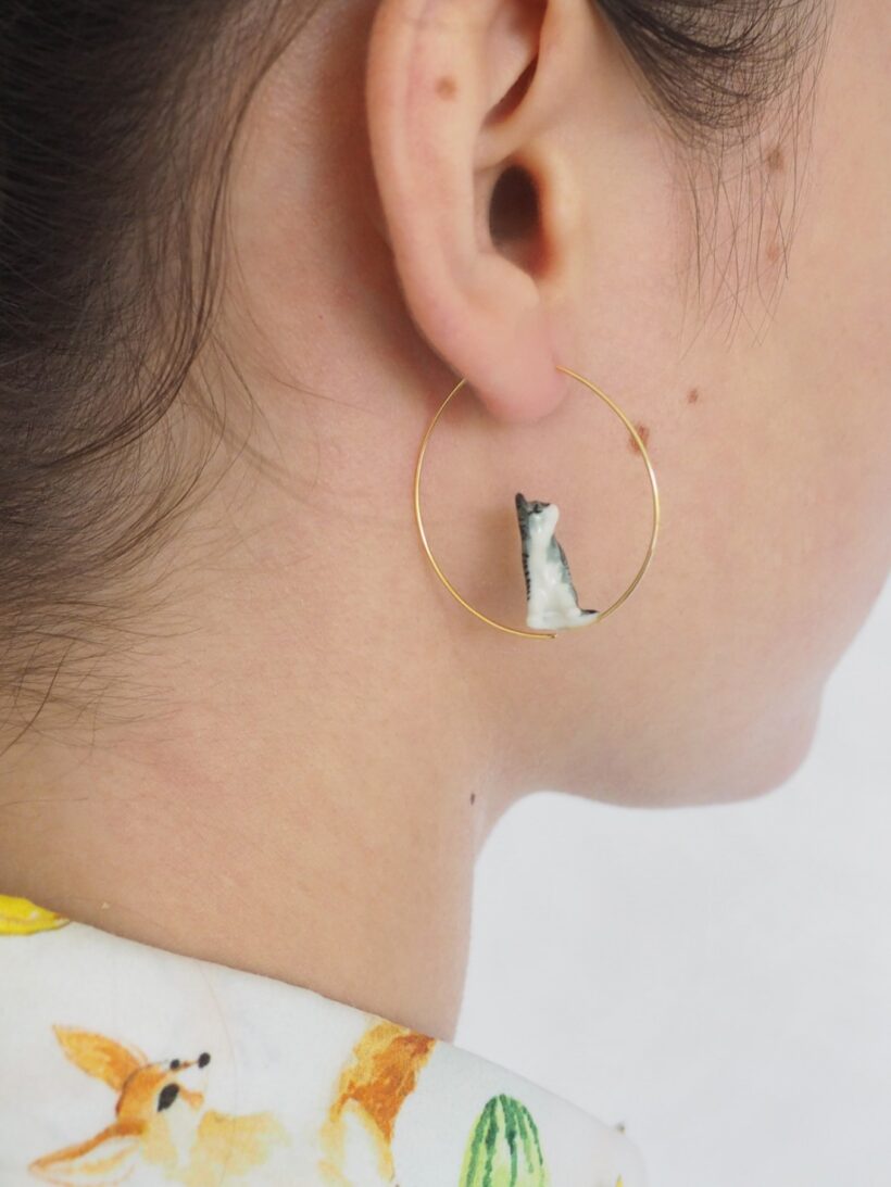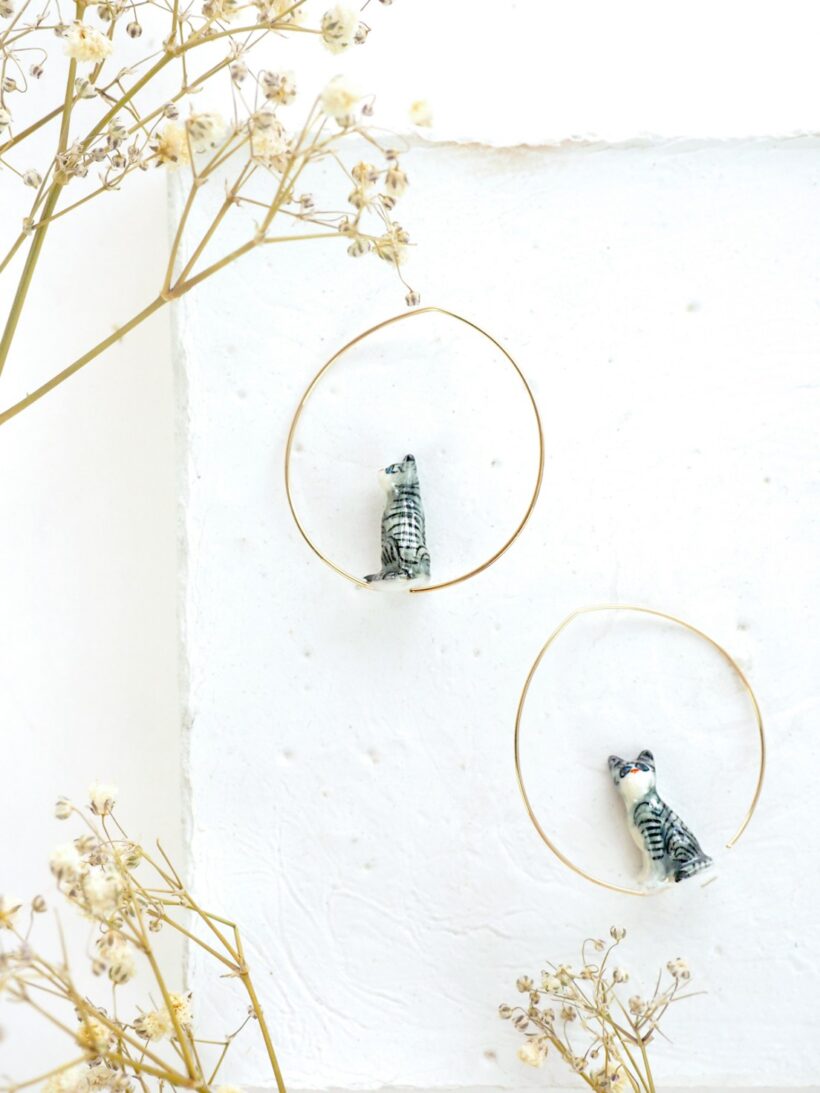 Orecchini a cerchio sottili in ottone dorato con piccolo gatto in porcellana dipinto a mano.